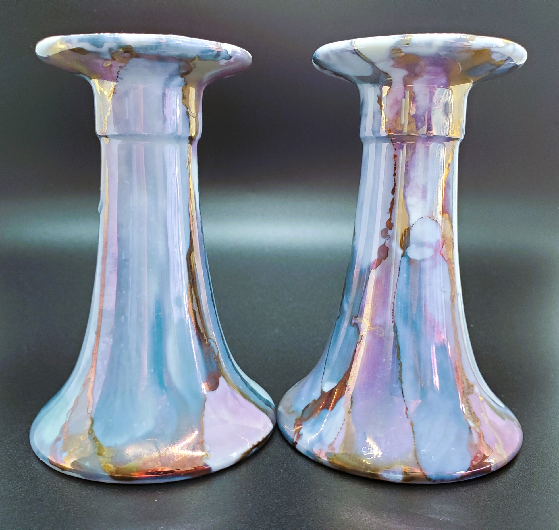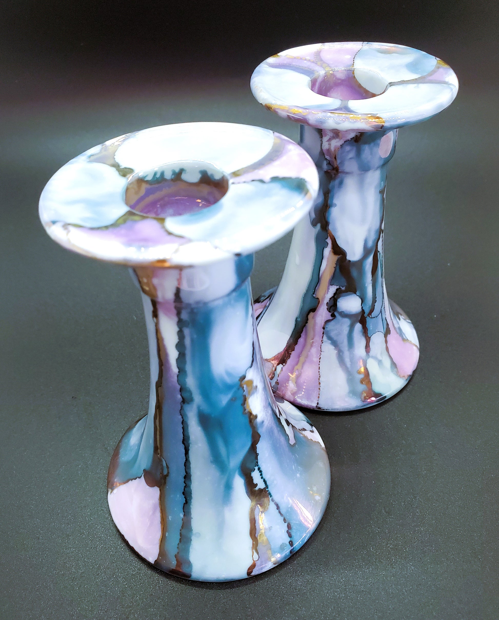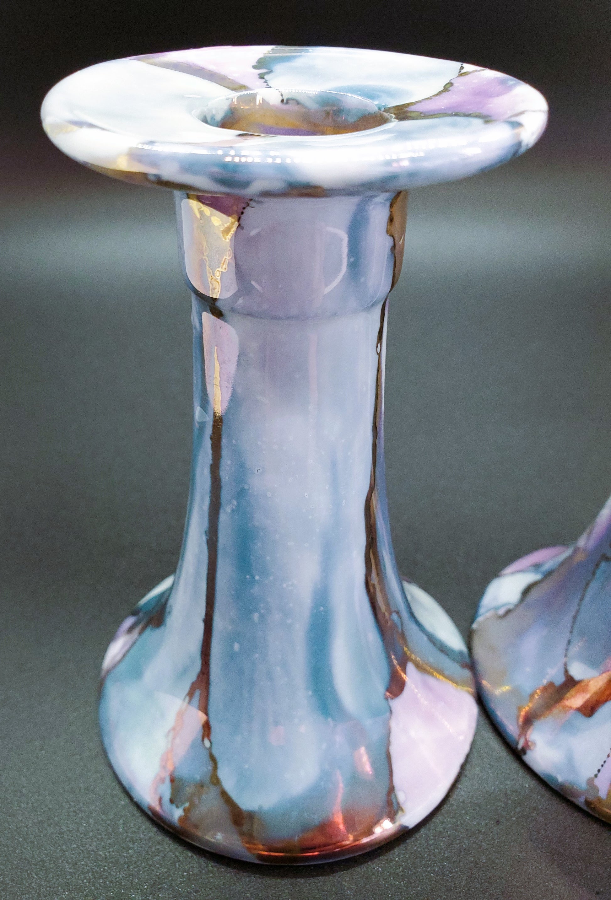 Maine Porcelain By S Designs Brewer Maine Hand Made Candle Stick Holders Purples Blues Gold Set of Two