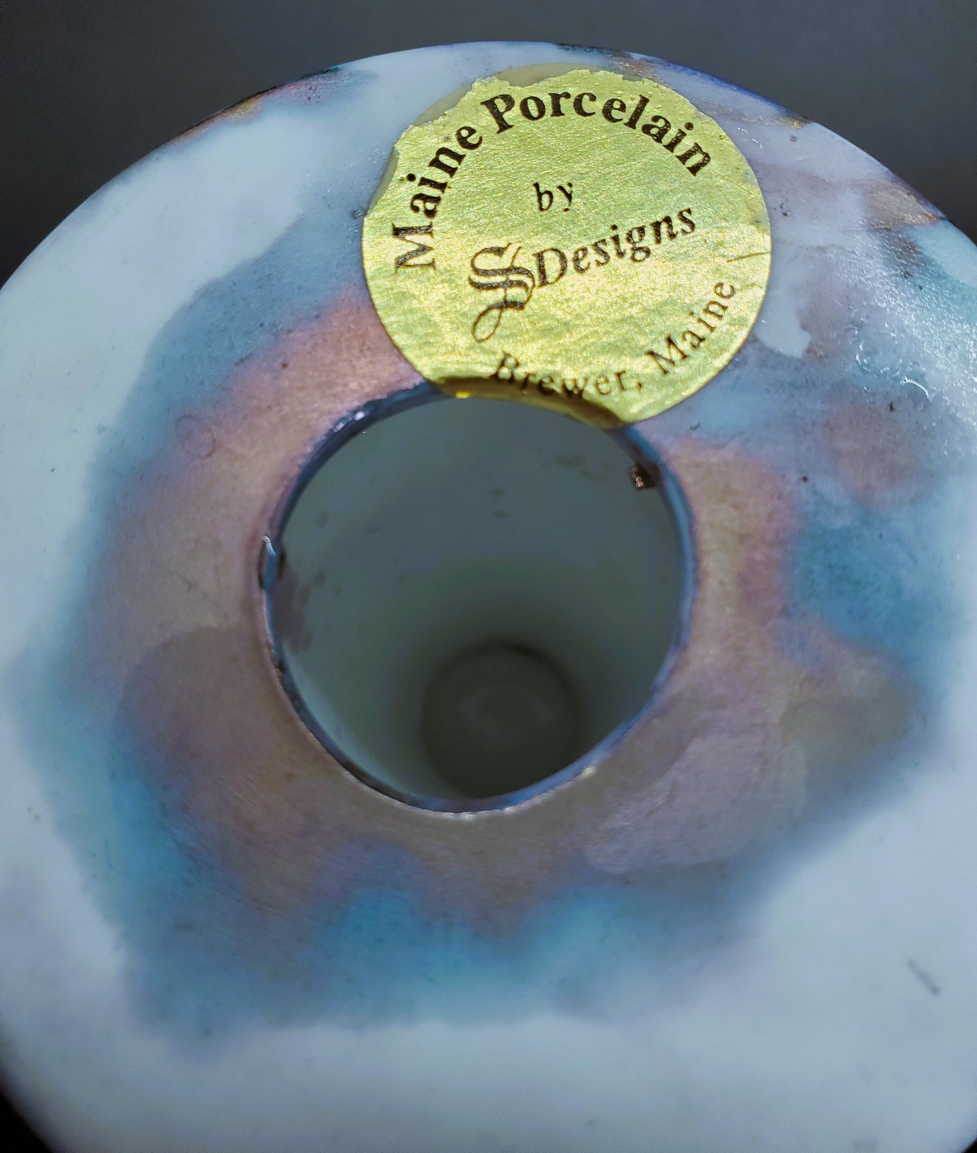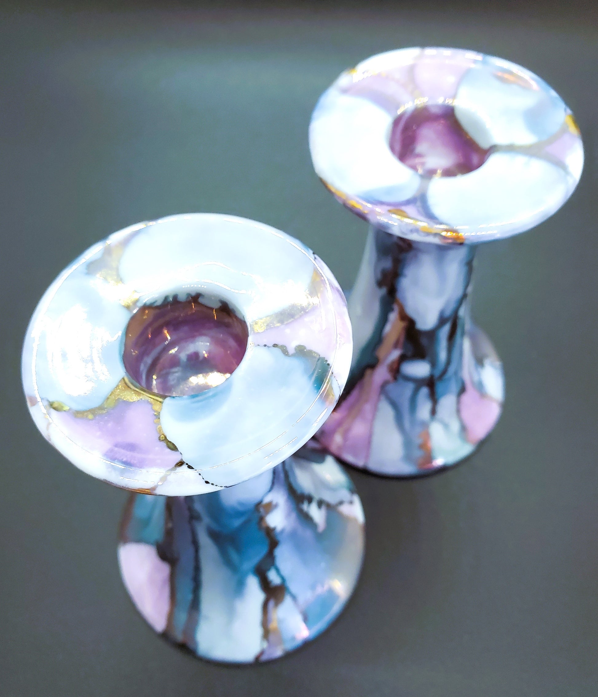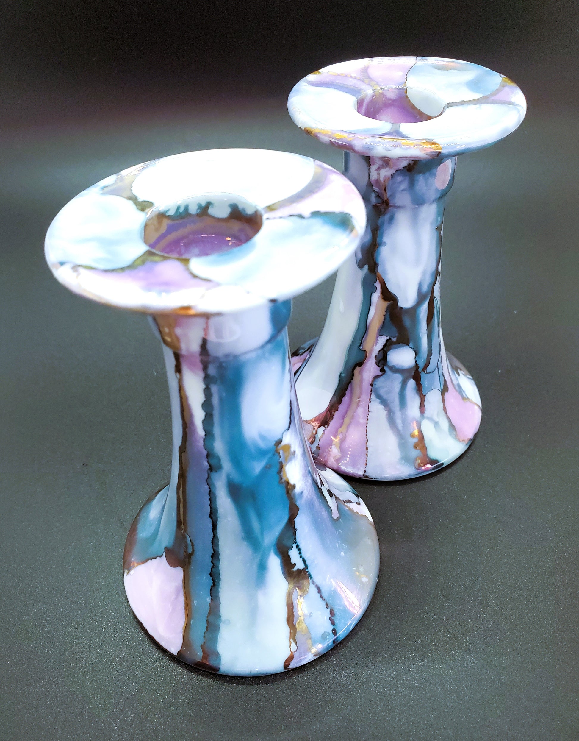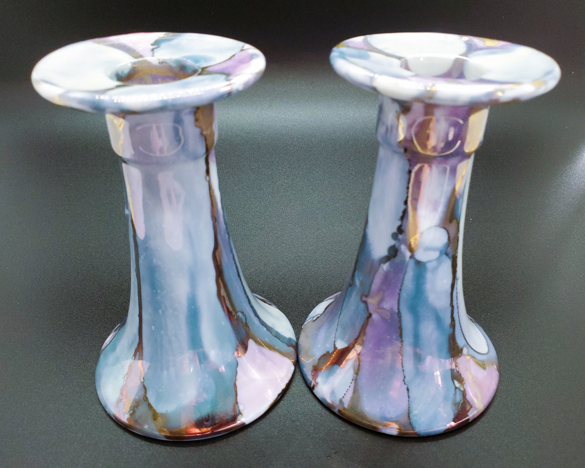 Maine Porcelain By S Designs Brewer Maine Hand Made Candle Stick Holders Purples Blues Gold Set of Two