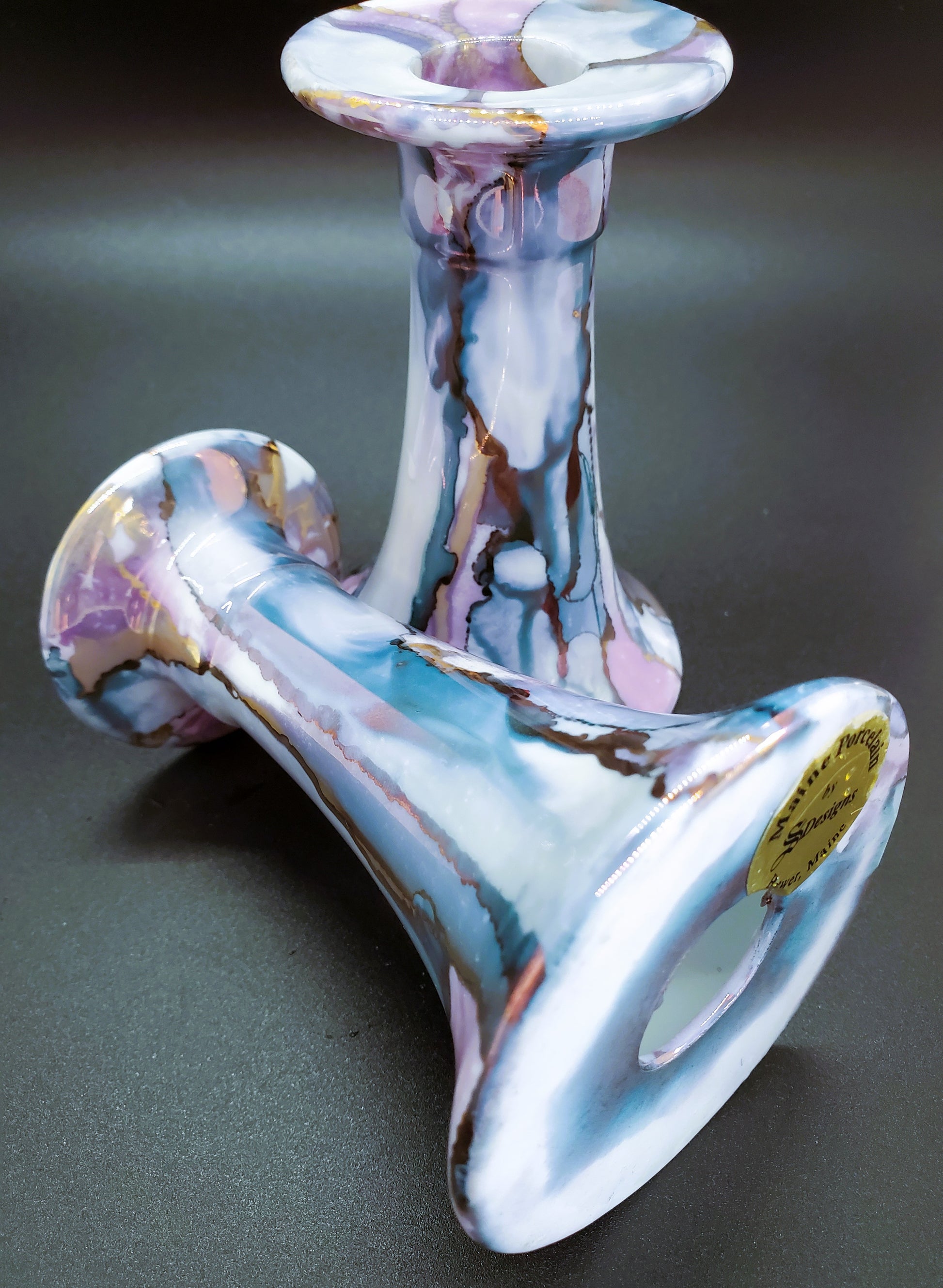 A beautiful set of two hand made porcelain candle stick holders by S Designs of Brewer Maine. Each is adorned with swirls of bright blues, purples and gold drizzle.