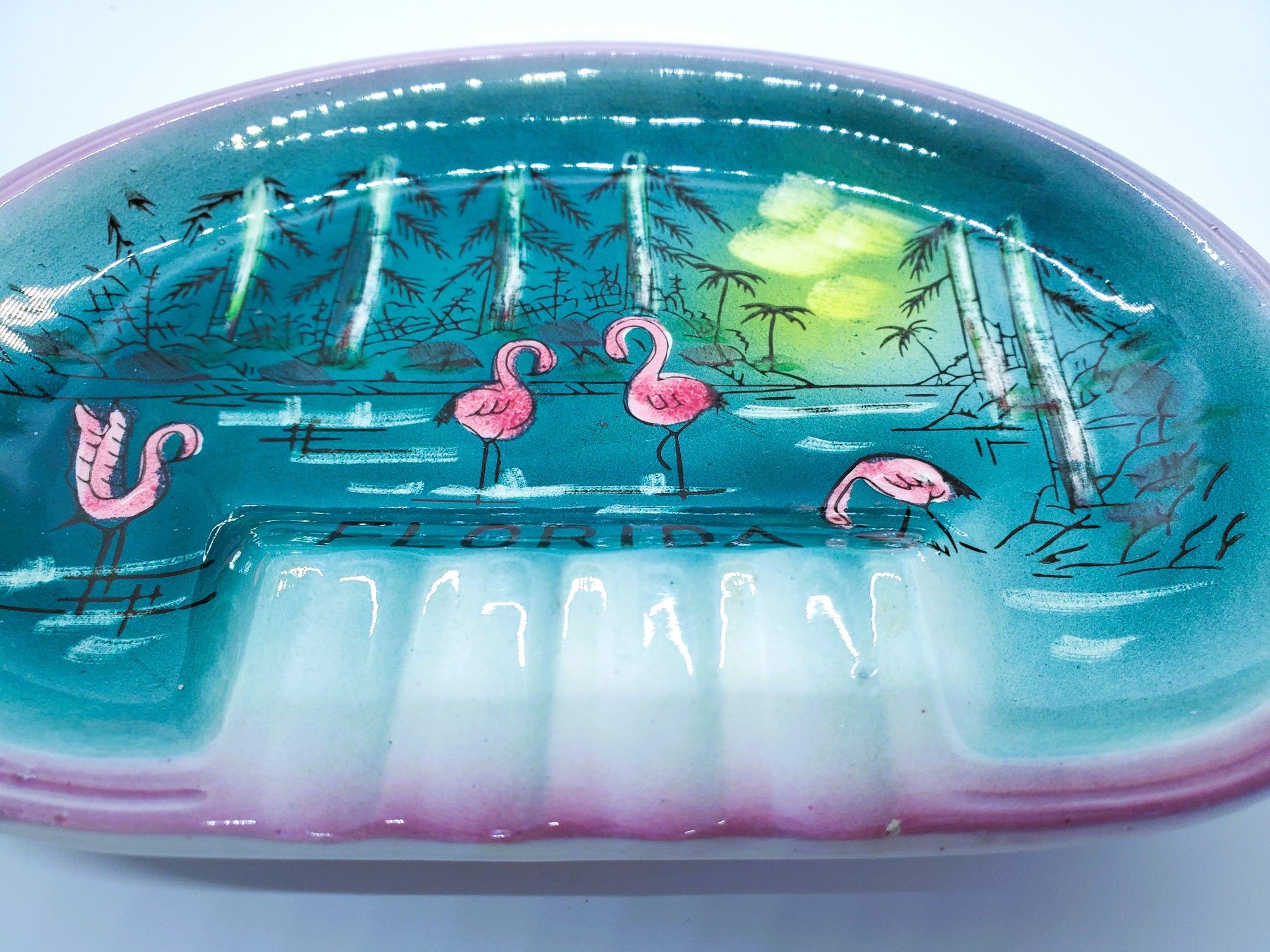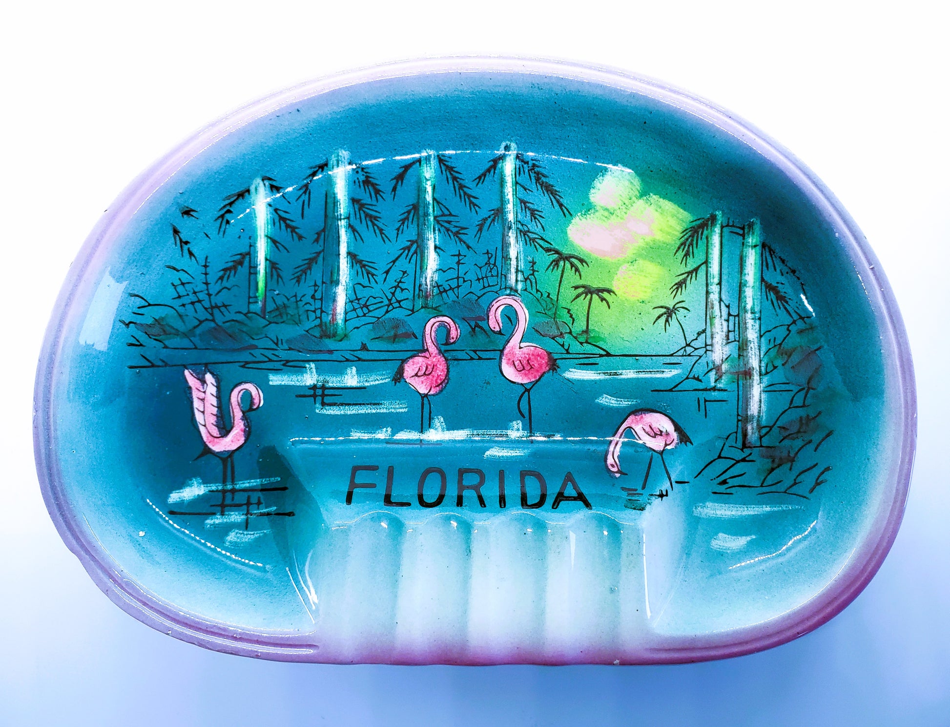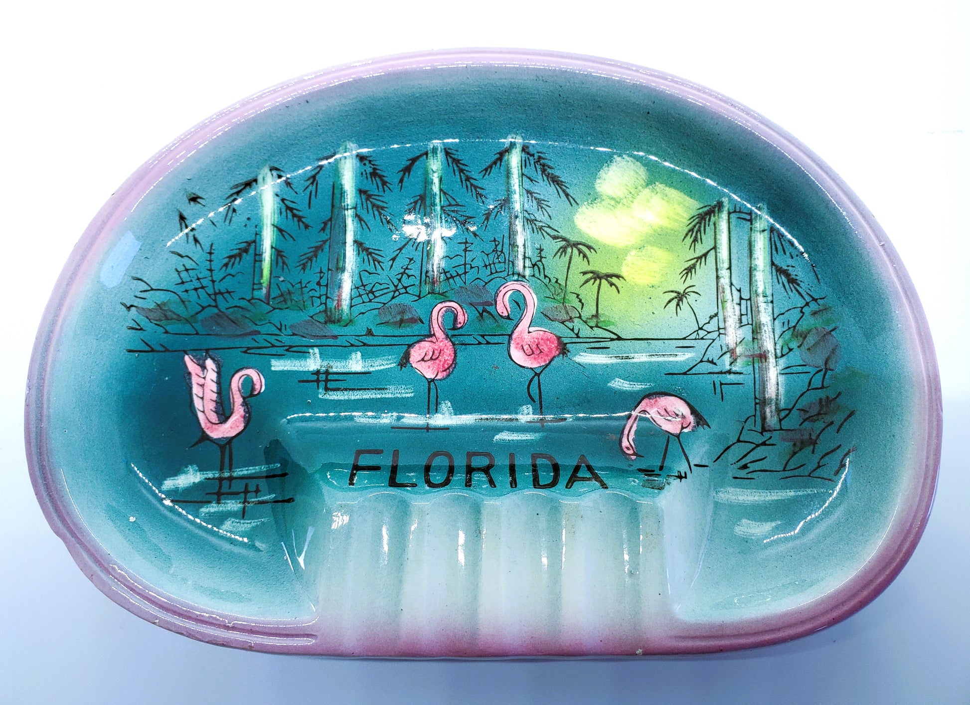 For you consideration is this really neat, vintage, souvenir of Florida ashtray featuring wading flamingos.